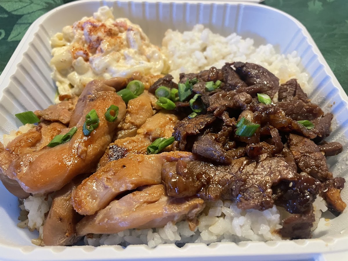 Combination BBQ Chicken and BBQ Beef with Rice and Macaroni Salad